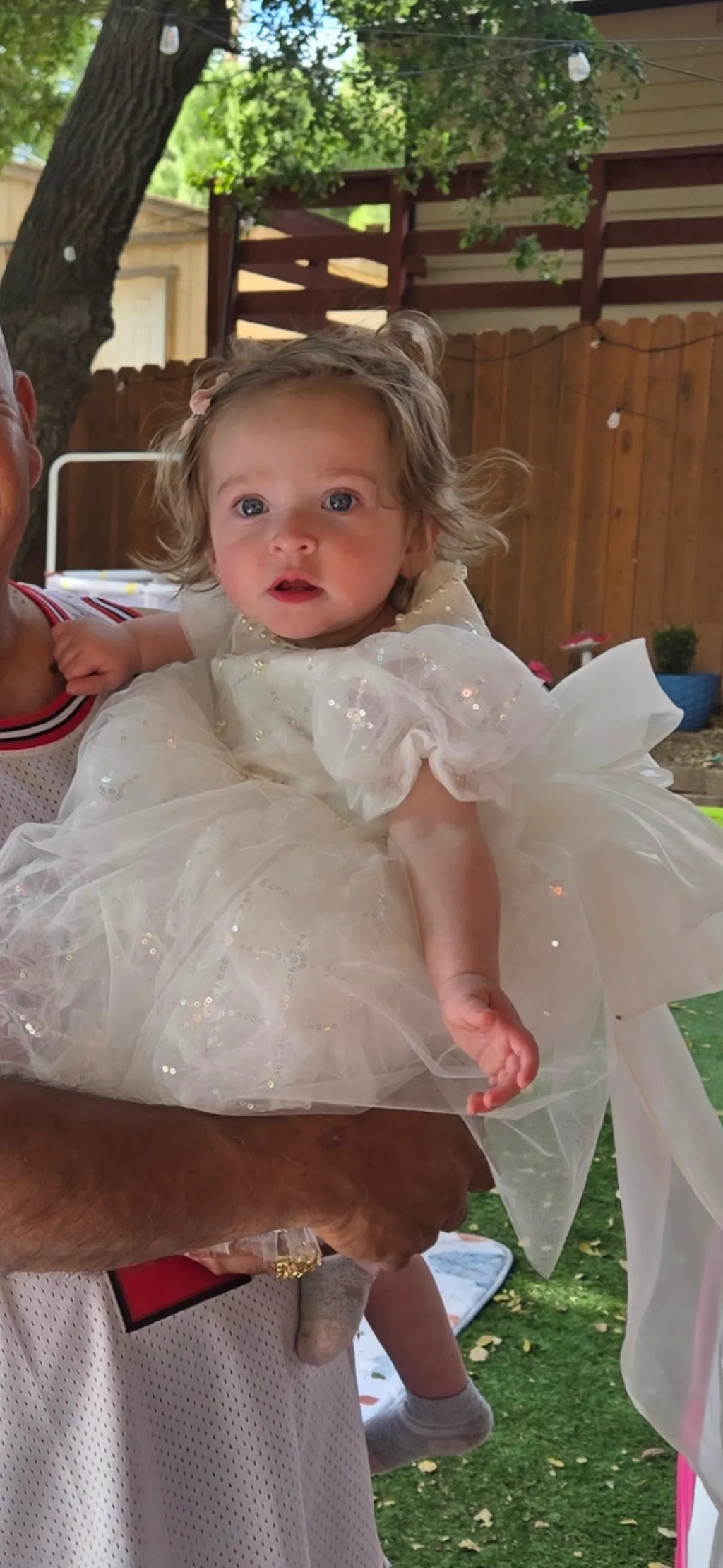 Capture the innocence of her first milestones with a gown fit for a little angel. Adorned with delicate pearls and a cloud of soft tulle, this dress turns every moment into a cherished memory.