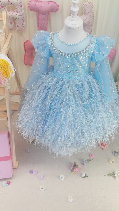 Vestido de princesa para cumpleaños de niña pequeña, de manga larga, hasta la rodilla, con lentejuelas y tul color azul cielo